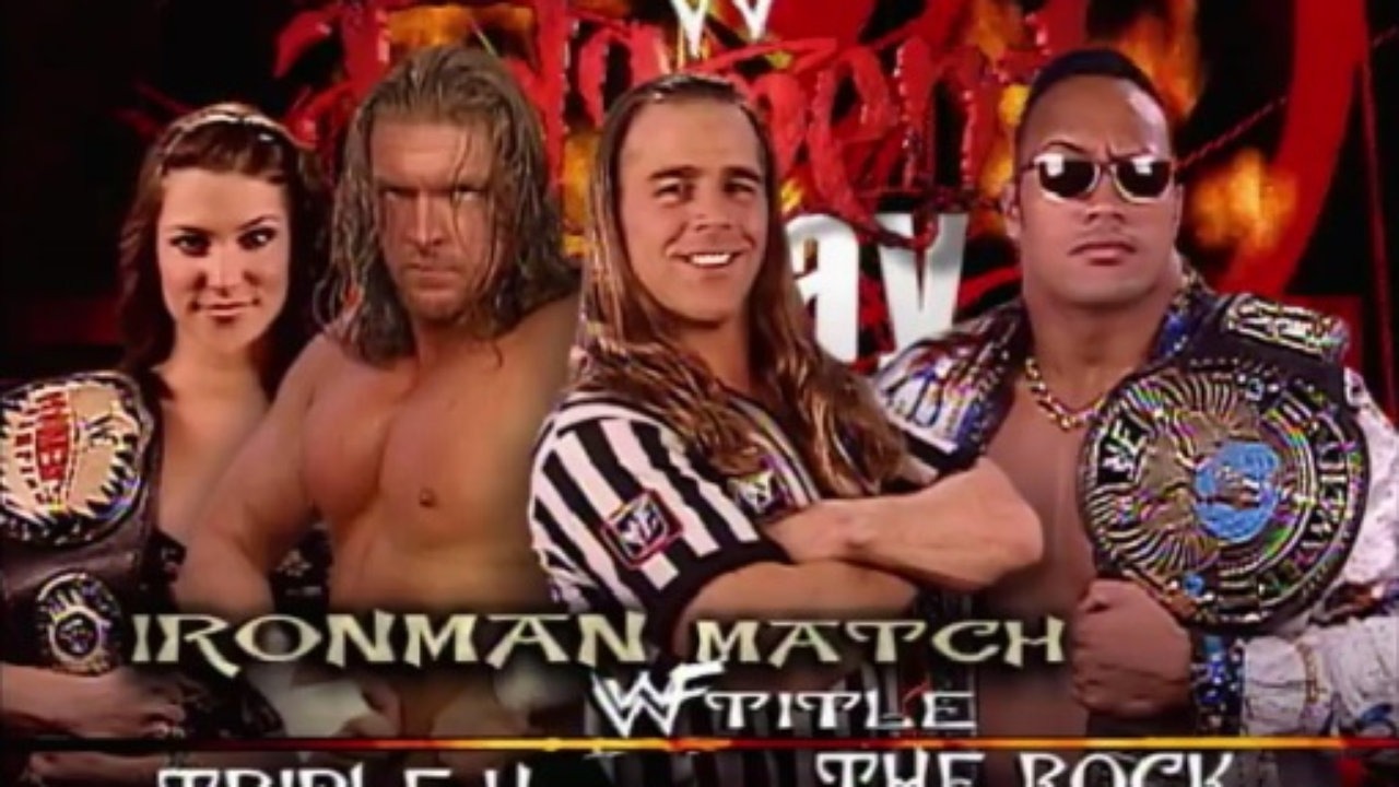 Helmsley won the WWF title, via a DQ in the 11th fall, which actually ended at 60:08, which wasn’t supposed how it was supposed to happen. A sellout crowd of 16,827 in the building, which was 15,886 paying $596,050 and another $130,256 in merchandise, saw, with a few seconds remaining on the scoreboard clock, panicked officials turn the clock off which negated the buzzer going off at the 60:00 mark, realizing they were in a position where it would be at least ten seconds from the scheduled DQ and then hit the buzzer after the tombstone on HHH by the returning Undertaker, which caused Rock to be disqualified in the final fall and thus lose six falls to five in a match where the title could change hands via DQ.