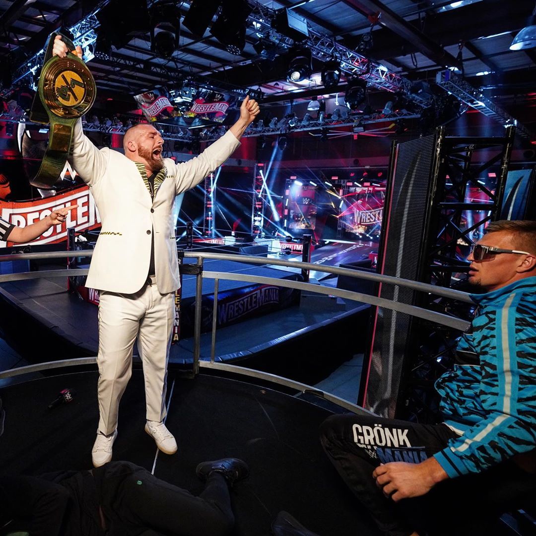Rawley pinned R-Truth on tonight’s WrestleMania night one broadcast to win the 24/7 title. Rawley’s friend Rob Gronkowski tried to pin R-Truth first, but Rawley pulled Gronkowski off and won the title instead.
