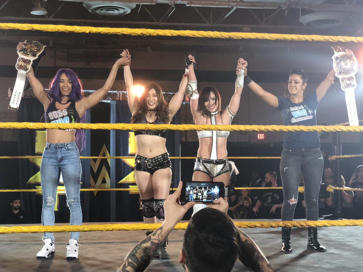 After attending Thursday’s WrestleMania 36 announcement press conference in Tampa Bay, Banks & Bayley cut an in-ring promo at the NXT house show and watched Io Shirai & Kairi Sane vs. Aliyah & Vanessa Borne vs. Rhea Ripley & Reina Gonzalez from ringside.