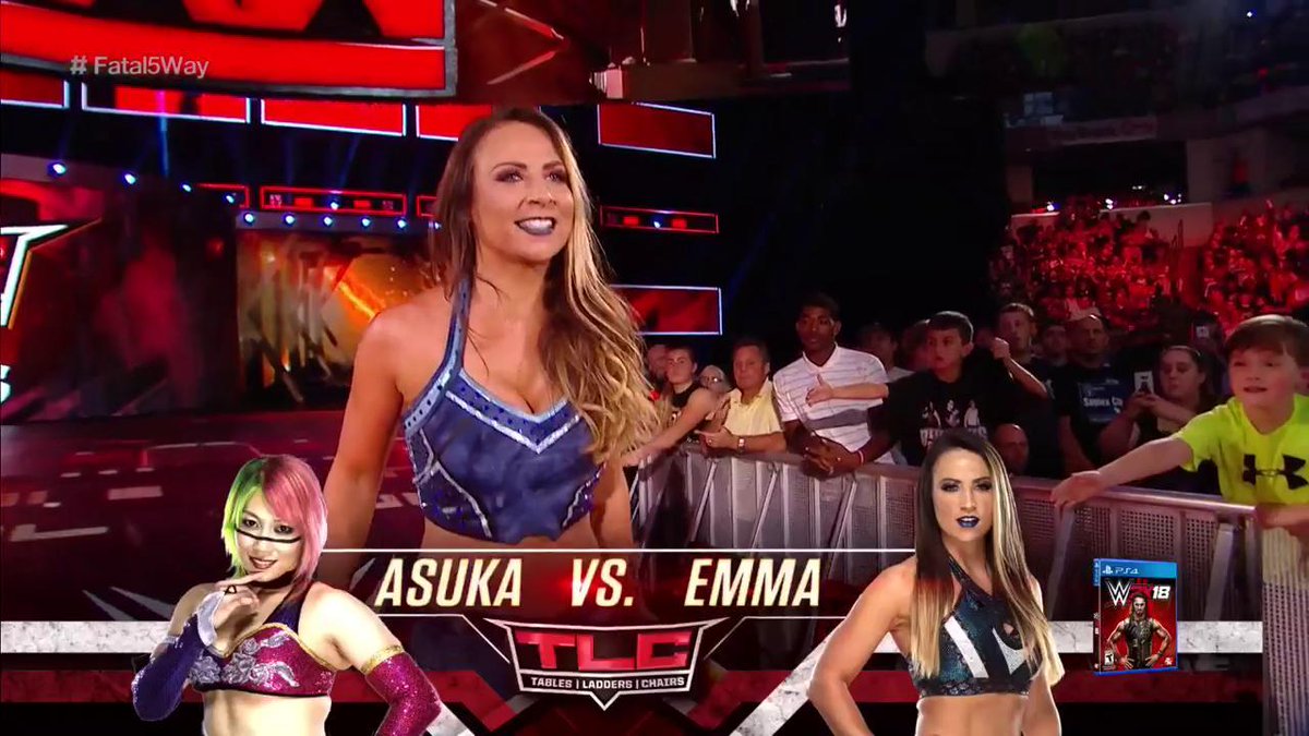 Emma won a fatal five-way elimination match on Raw tonight and will be facing Asuka at TLC on October 22nd. Dana Brooke, Bayley, Alicia Fox, and Sasha Banks were also in the fatal five-way match, with Emma sneaking up on Banks for the last elimination after Banks had submitted Fox with the Banks Statement.