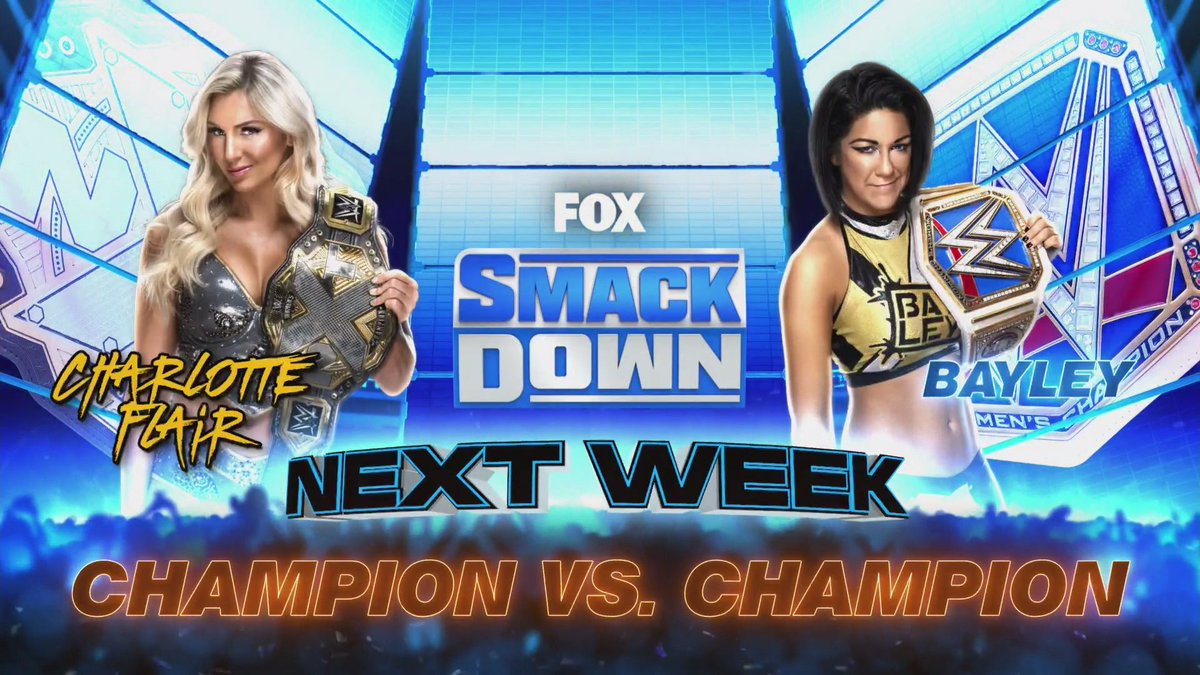 – NXT Women’s Champion Charlotte Flair and SmackDown Women’s Champion Bayley will face off in a non-title champion vs. champion match on next Friday’s show. That was set up when Charlotte appeared on SmackDown tonight as part of the brand-to-brand invitation.