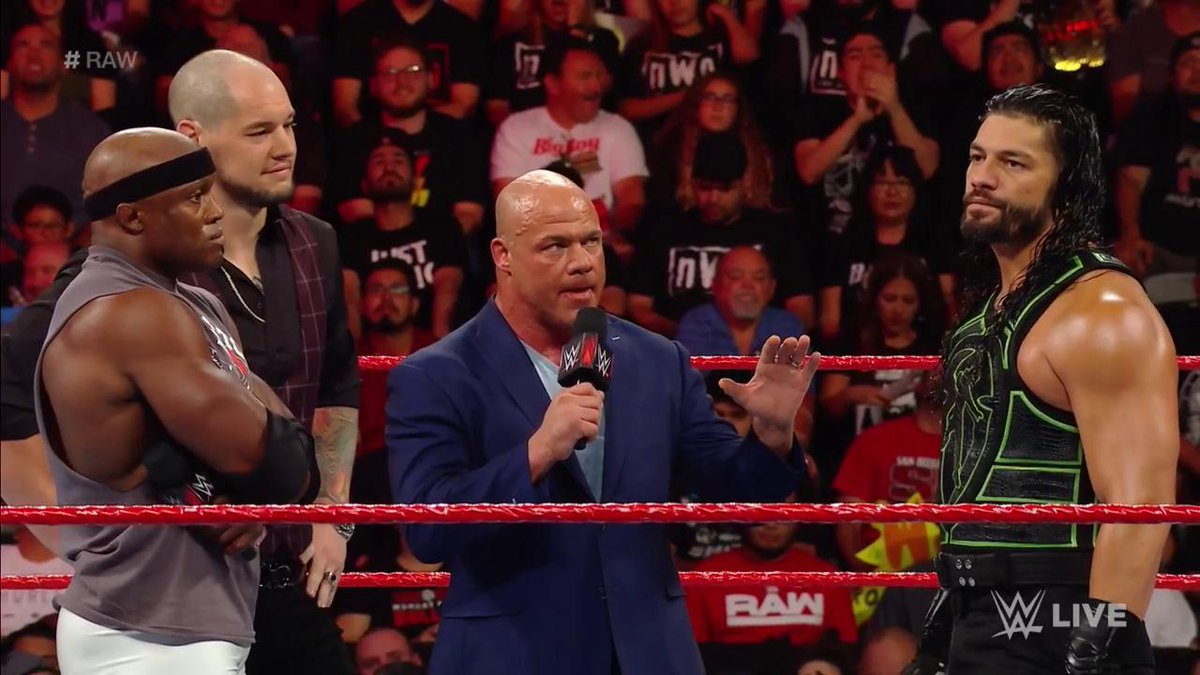 Tonight’s Raw opened with a segment where WWE had Kurt Angle announce that, due to a storyline where there was a snag in negotiations with Universal Champion Brock Lesnar, the match to decide Lesnar’s next challenger was — at least for now — no longer on the table. A singles match between Roman Reigns and Bobby Lashley, who were the only two wrestlers confirmed for the multi-man, was instead teased.