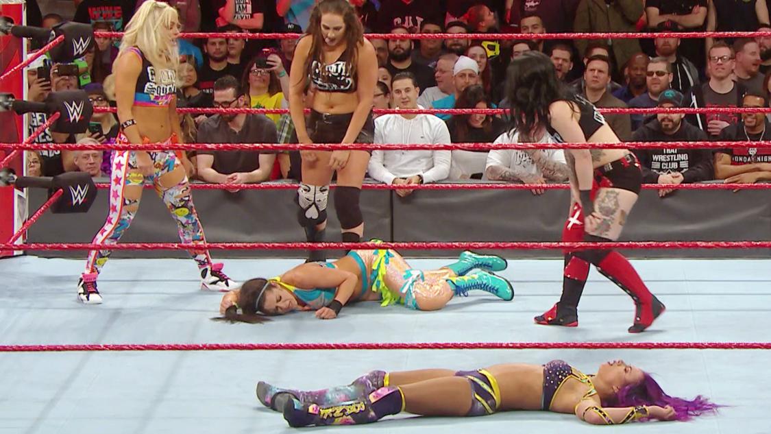 The Riott Squad (Ruby Riott, Liv Morgan, and Sarah Logan) first moved over from SmackDown, interrupting a match between Sasha Banks and Bayley. Banks had the Banks Statement locked in and Bayley was reaching for the ropes when The Riott Squad attacked them both.