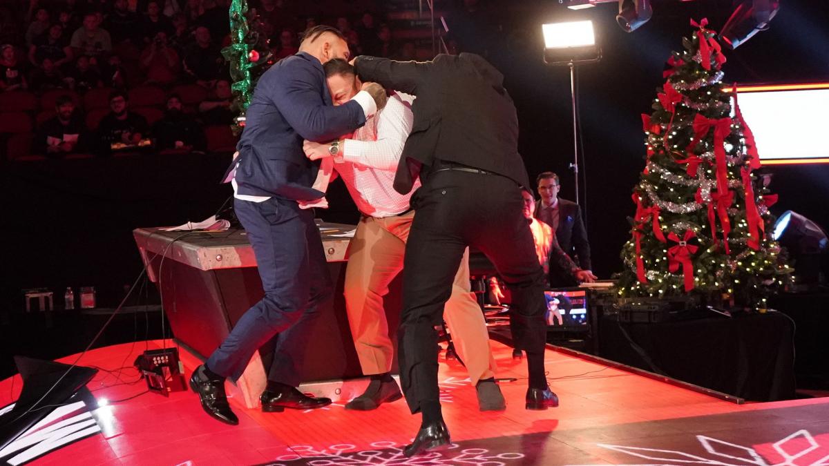Joe told AOP that if he got up it wasn’t going to just be to move. They went face-to-face and — after Rollins tried to calm things down — he told AOP to finish Joe. Rollins laid out Mysterio with a curb stomp, then Akam and Rezar slammed Joe through the announce table.