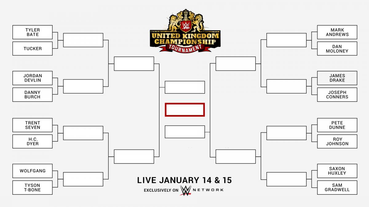 With the 16-participant field having been confirmed last week, today saw WWE unveil the bracket (along with the eight first round matches) for this weekend’s United Kingdom Championship tournament.