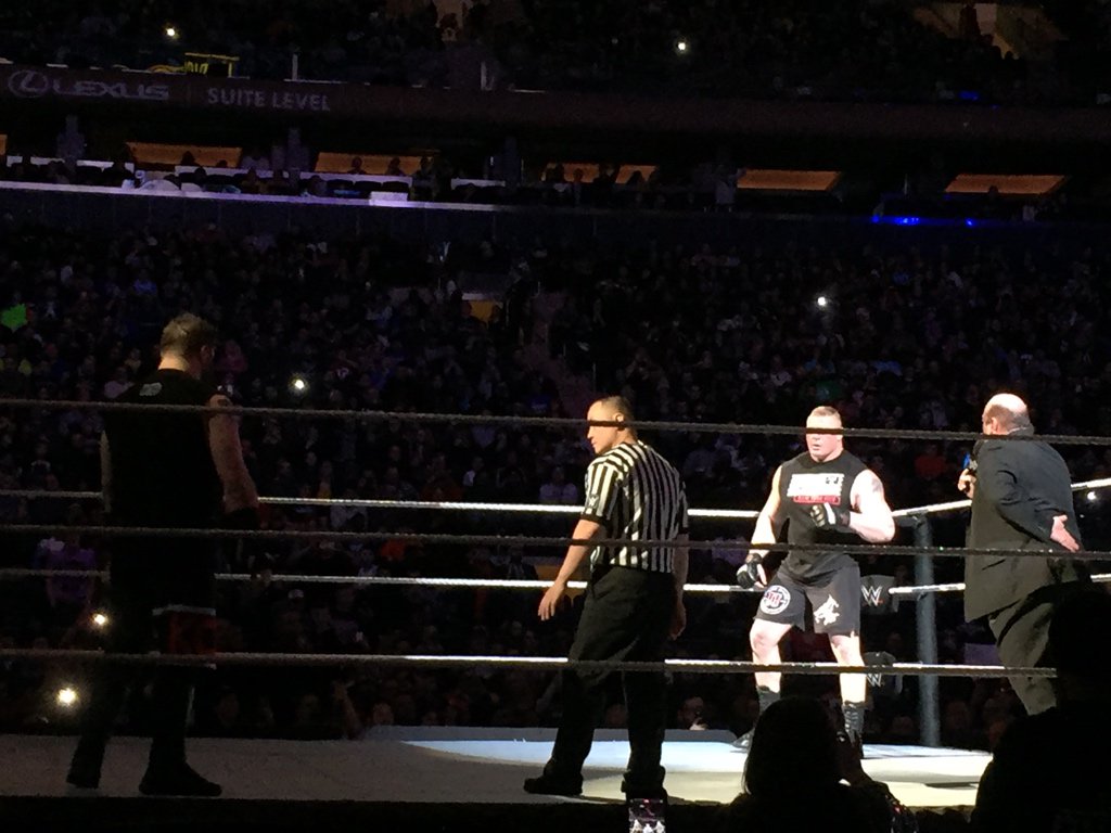 Owens attacked Lesnar at the bell as Lesnar was taking off his shirt. Owens got some offense in, including a somersault cannonball into the corner but Lesnar turned it around. Lesnar hit four German suplexes and won with the F-5 in three minutes. The fans then chanted for Goldberg but Lesnar left the ring with nothing else occurring after the match.