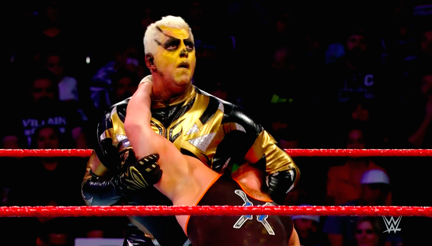 After Hawkins had looked like he might break the streak, he took too long and didn’t pounce on the opportunity when it arose. The finish saw Goldust show that he’d had enough of being shoved around and dropped to his knees to slap Hawkins in the face before hitting the Golden Cross for the win.